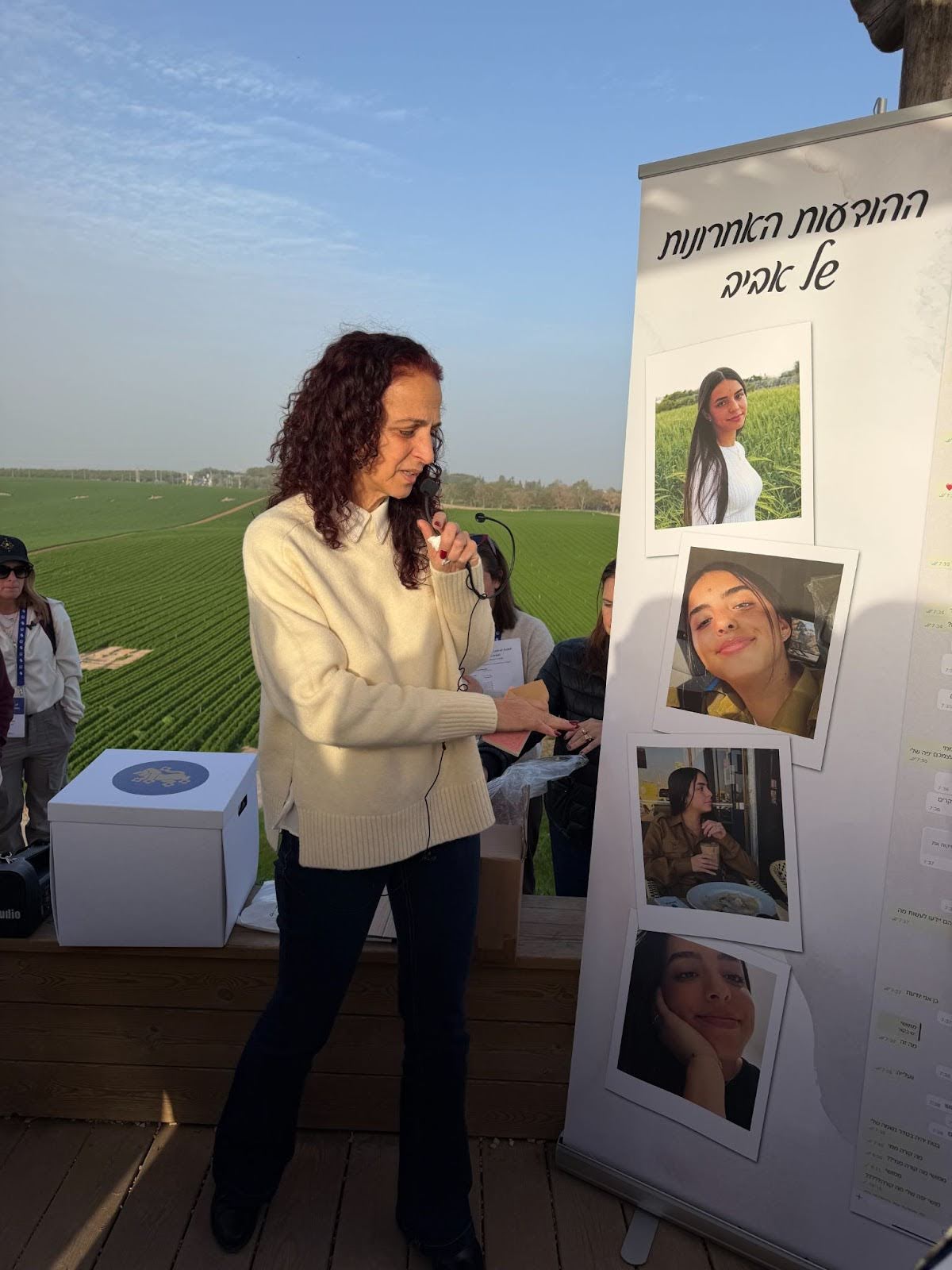 Later that afternoon, we met Mira Hajaj at the Observer’s Memorial, a site she and her family built themselves. Mira shared the story of her daughter Aviv, whose role was to observe Gaza and report anything unusual. Aviv and her fellow observers did exactly that, reporting suspicious activity, including farmers being switched out, digging, and burning tires, only to be ignored. Mira wept as she described Aviv’s kind and principled heart. Aviv chose black as her favorite color because she felt sad that no one ever chose the black crayon in the box. She stood up for what was right, even noticing when IDF soldiers’ quarters were missing mezuzot.