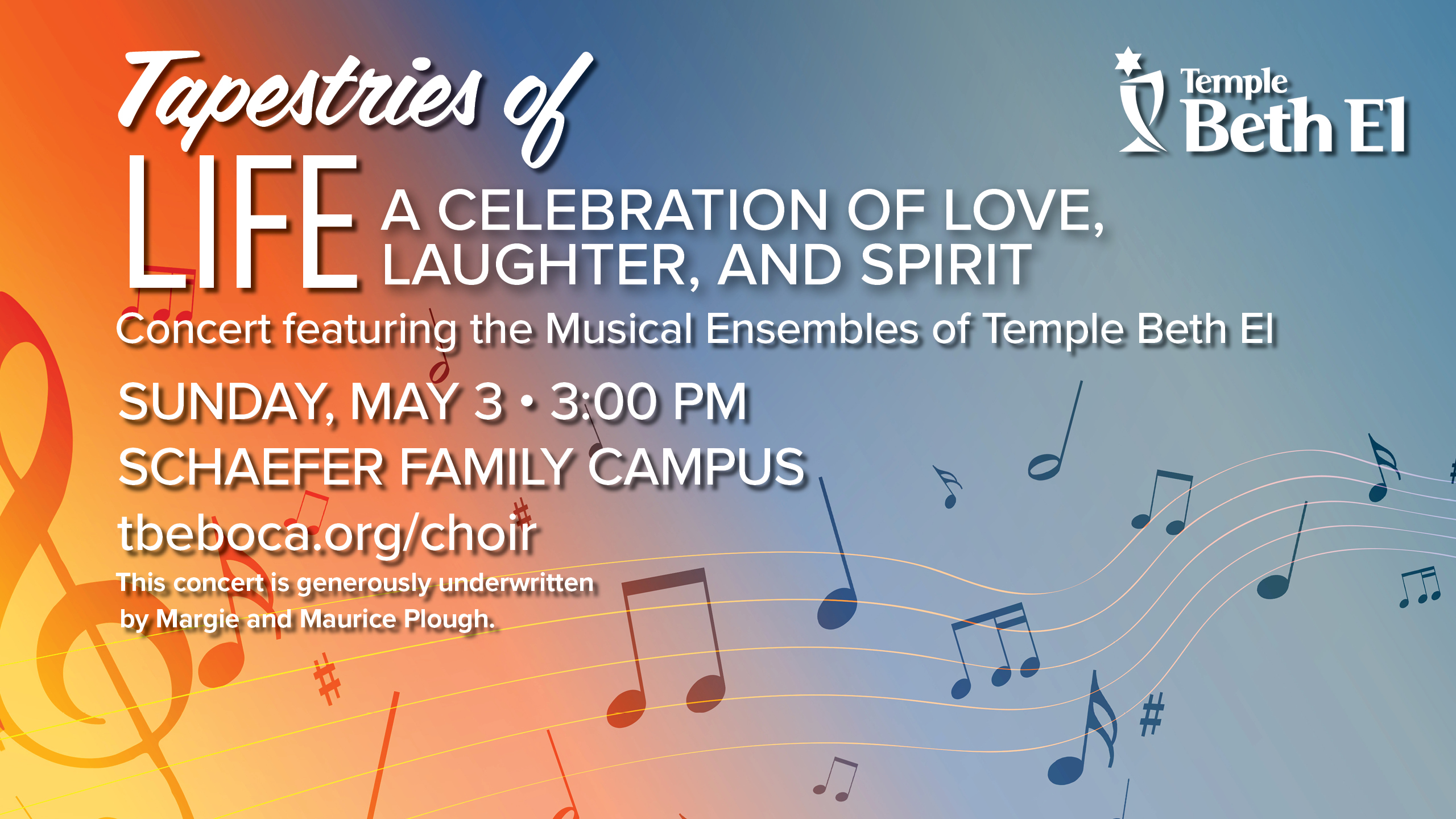 Join us at the Temple Beth El of Boca Raton Schaefer Family Campus at 333 S.W. 4th Avenue, Boca Raton, FL 33432 for a beautiful afternoon of music performed by the phenomenal Temple Beth El music ensembles. Enjoy beloved selections from some of your favorite Broadway shows, along with inspiring folk and pop classics. This multi-generational concert promises to be a memorable and meaningful afternoon you won’t want to miss. Free and open to the public. Registration is required at: tbeboca.org/choir